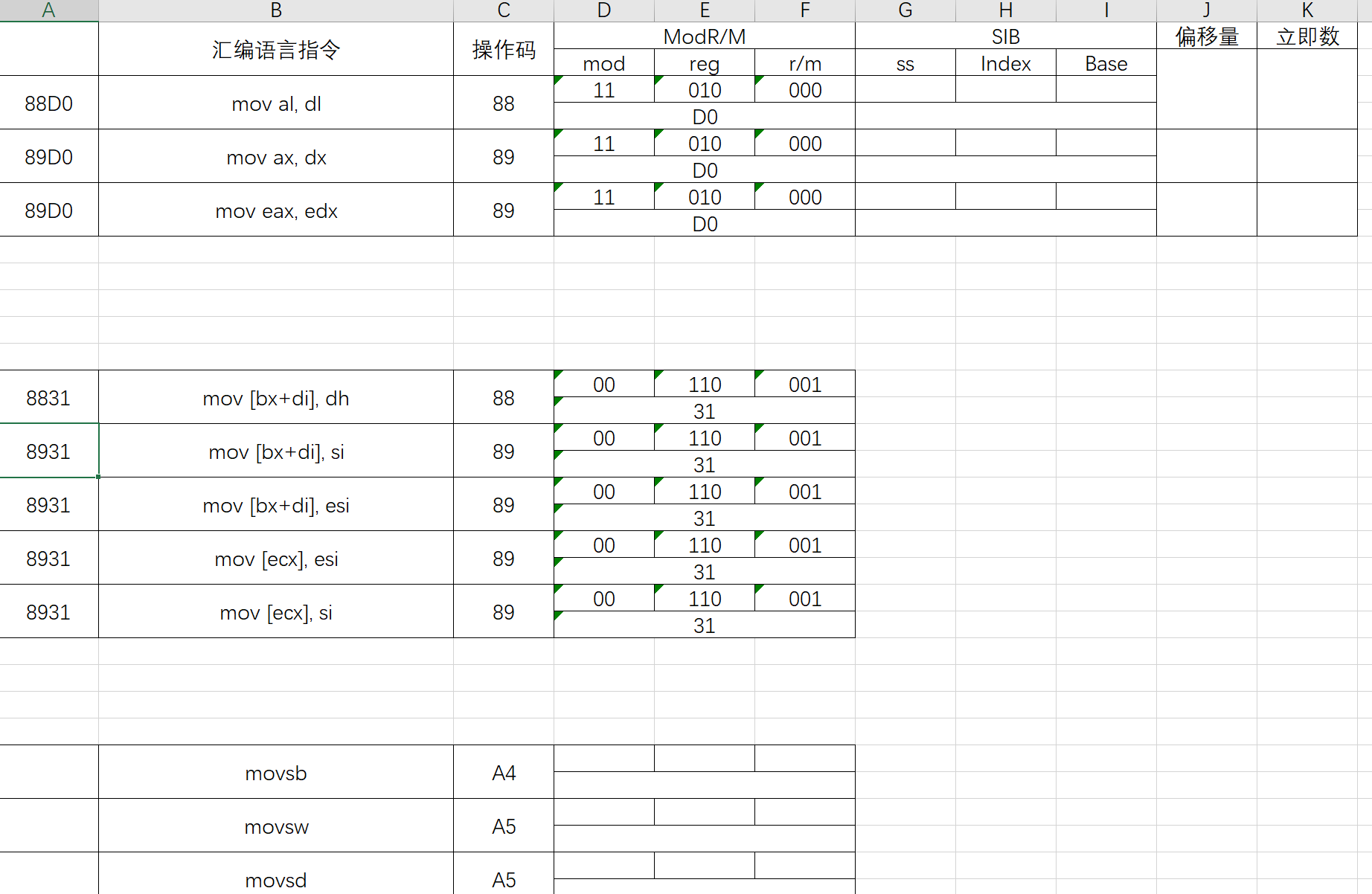 - 指令前缀:段超越前缀、总线封锁前缀、数据传送指令的重复前缀、操作尺寸反转前缀、地址尺寸反转前缀等等。指令最多有4个前缀。