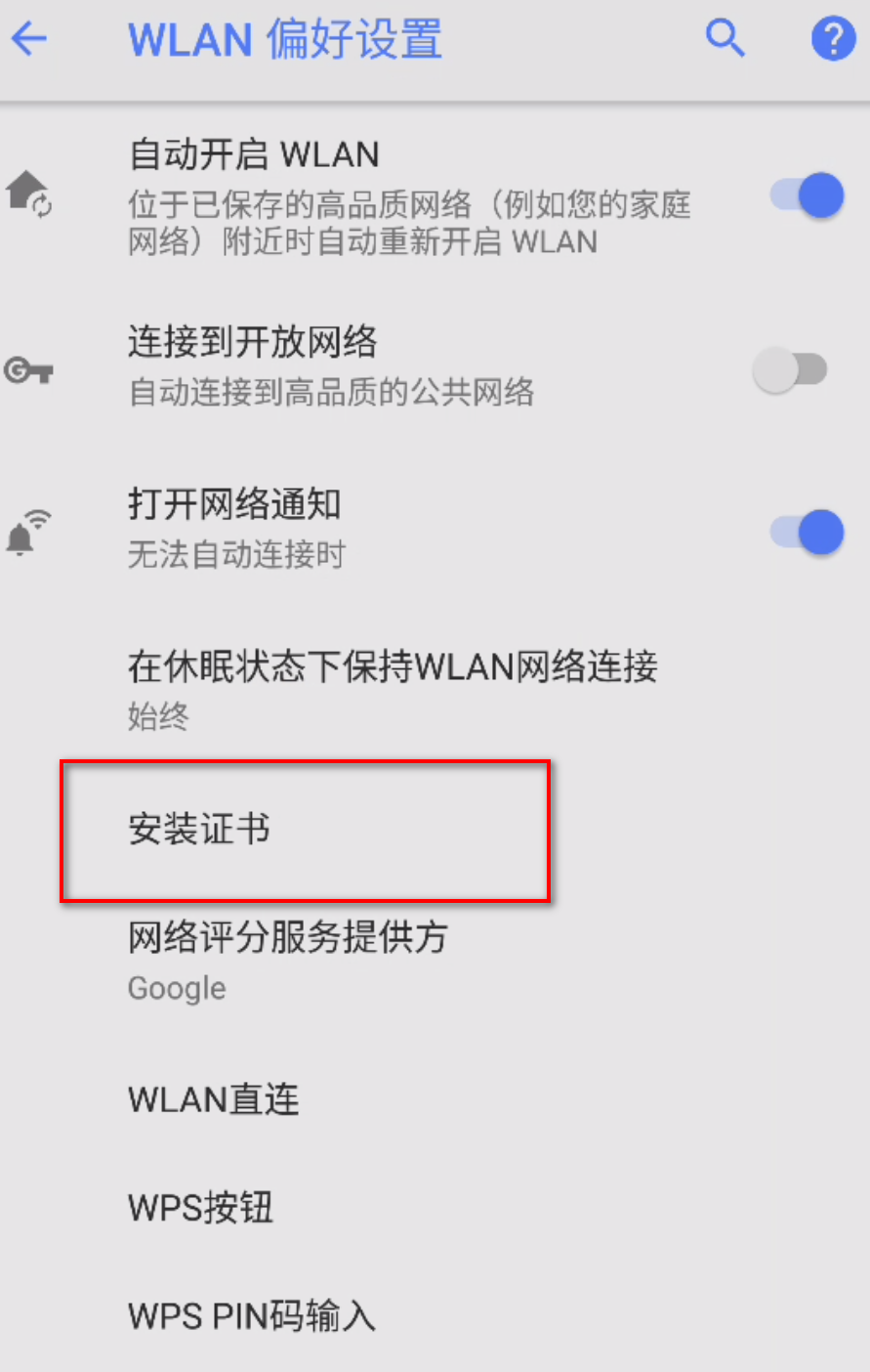 - Android10是在WLAN偏好设置处安装,不同版本的系统位置可能略有变化